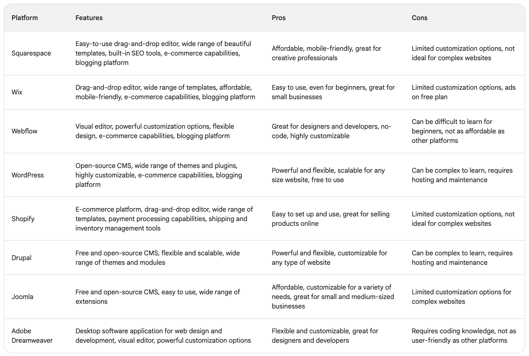 In this post, we'll compare eight of the most popular web design platforms: Squarespace, Wix, Webflow, WordPress, Shopify, Drupal, Joomla, and Adobe Dreamweaver. We'll discuss the features, pros, and cons of each platform so you can make an informed decision about which one is right for you.